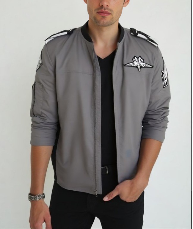 Product Features Inspired By: Casper Van Dien External Material: Cotton Inner: Viscose Lining Front: Zipper Closure Collar: Rib Collar Color: Gray Pockets: Two Inside Sleeves: Full-Length Sleeves Embroidered Patches on Both Sleeves and Chest